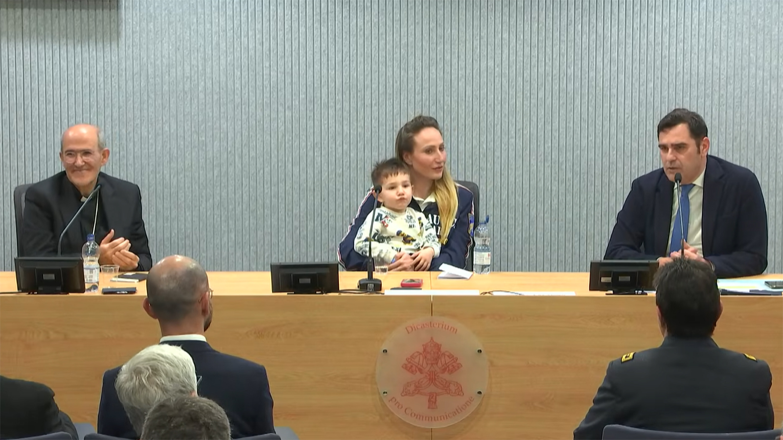 Tommaso was present at the press conference and rushed to sit on his mother’s lap, to the applause of curial officials and the cardinal. The Vatican sports team, Athletica Vaticana, gifted Lollobrigida with a shirt with the papal colors of yellow and white.